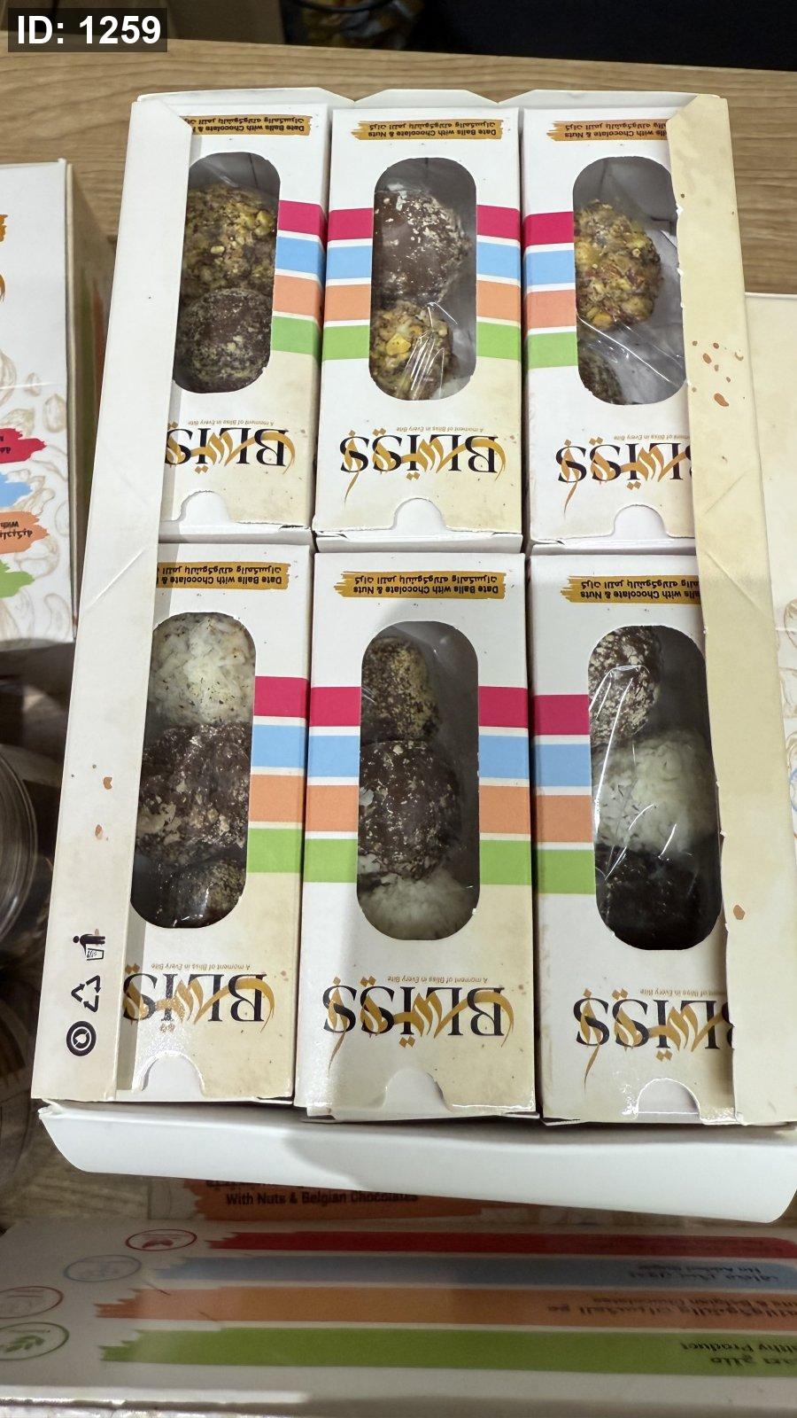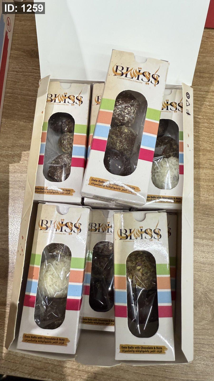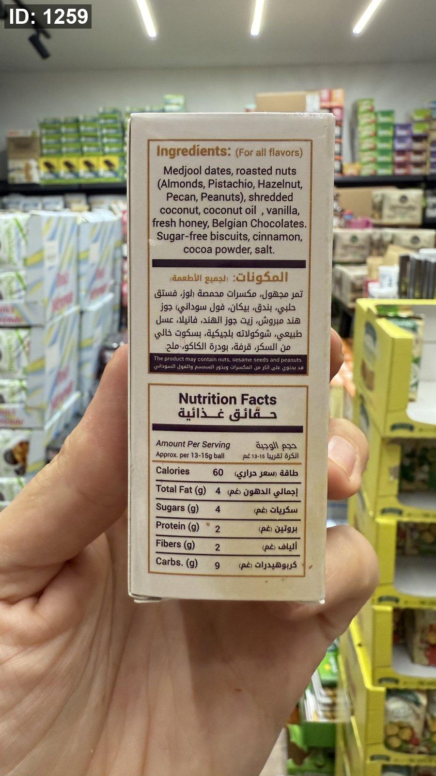 العلبة فيها 3 حبات من كرات التمر بالمكسرات والشوكولاته البلجيكية بدون سكر♥️ لذيذ جداً