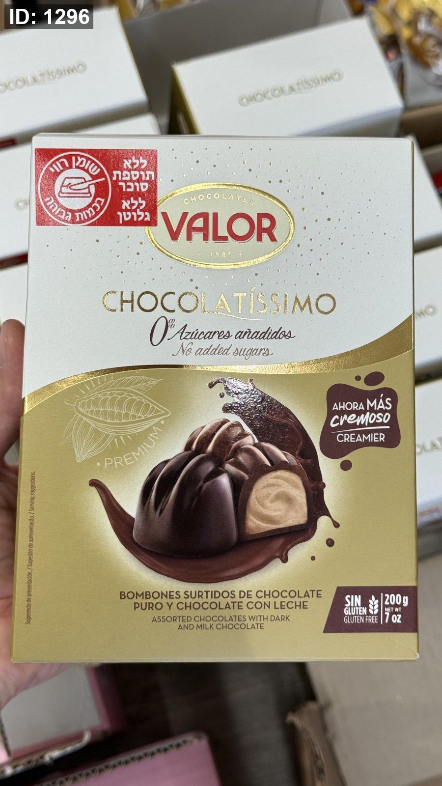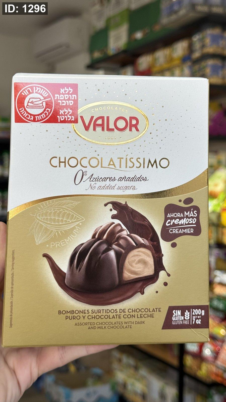علبة برلين Valor فيها تشكيلة من الشوكولاتة الحليب والدارك داكنة محشية مكسرات خالية من السكر والجلوتين وزنها 200غرام