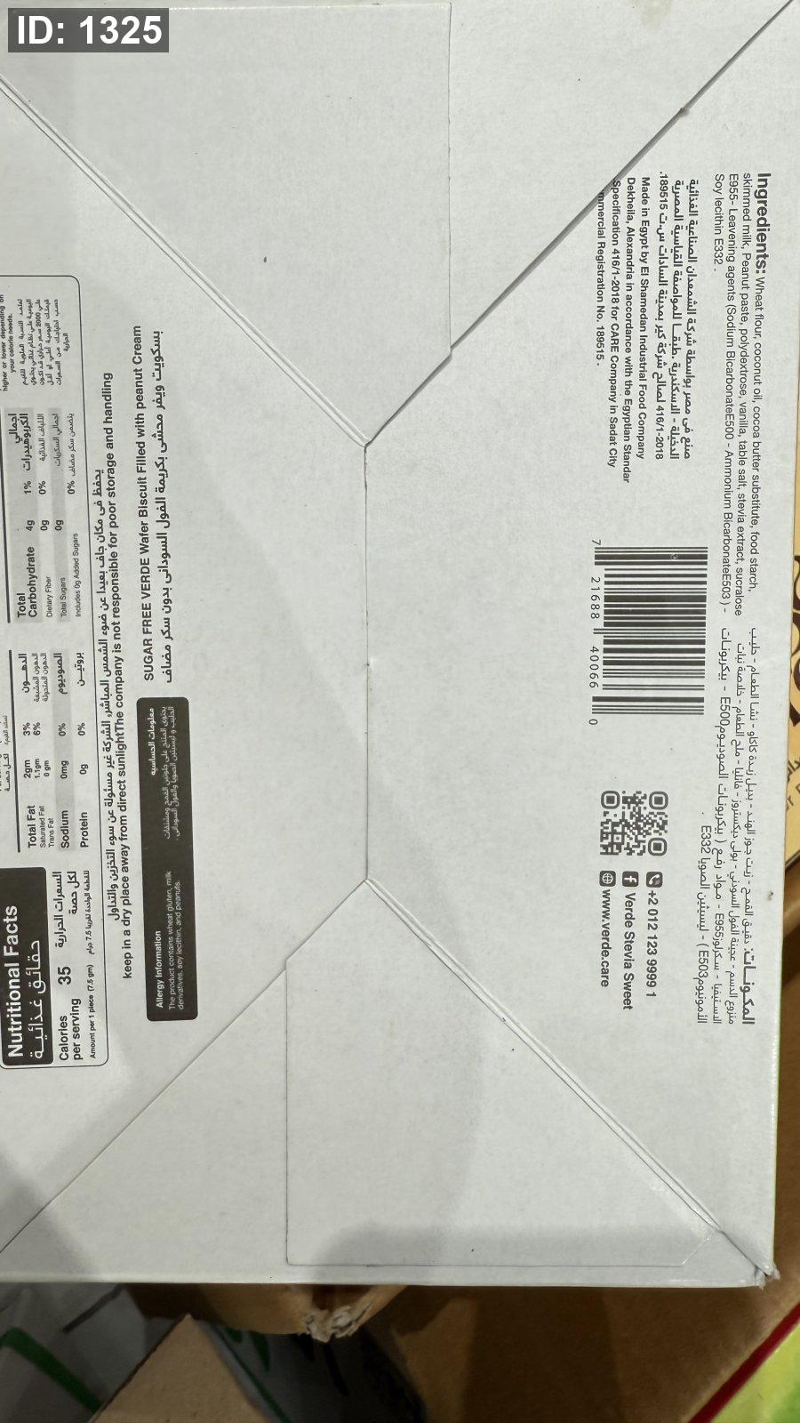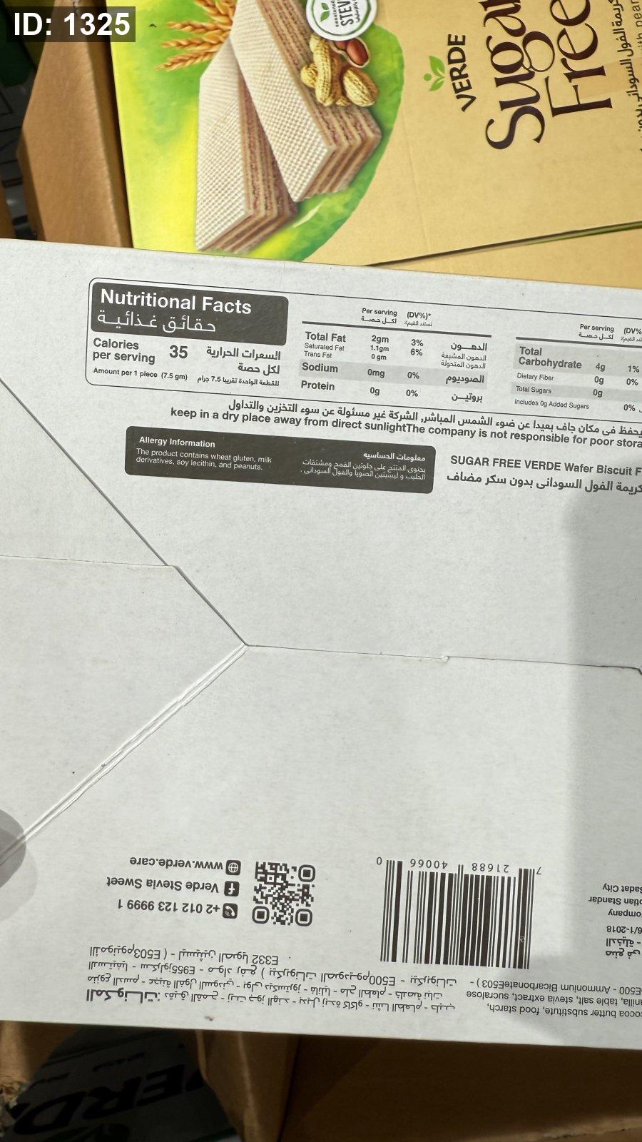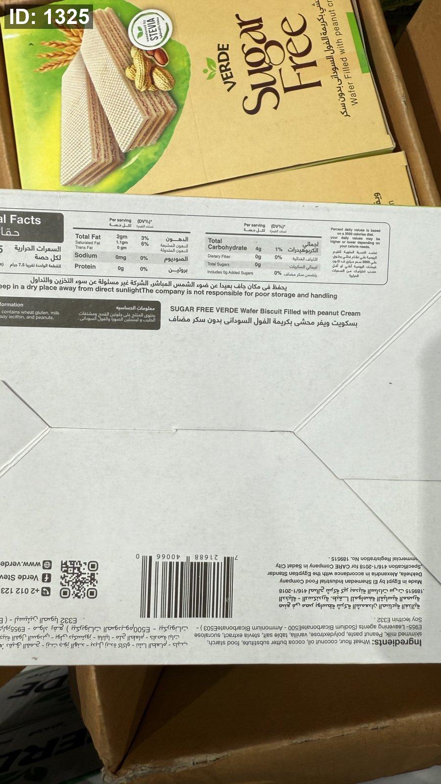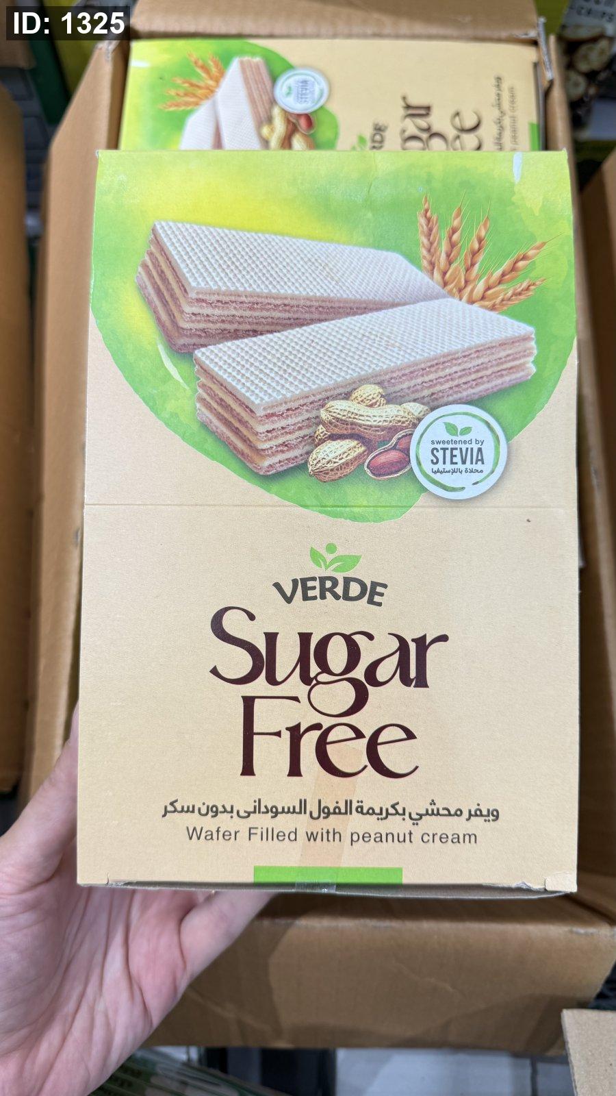 علبة من ويفر verde محشي كريمة الفول السوداني خالي من السكر فيها 15 حبة