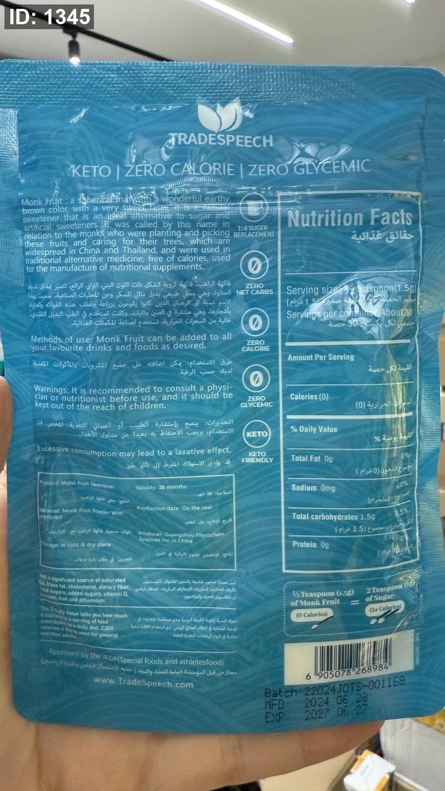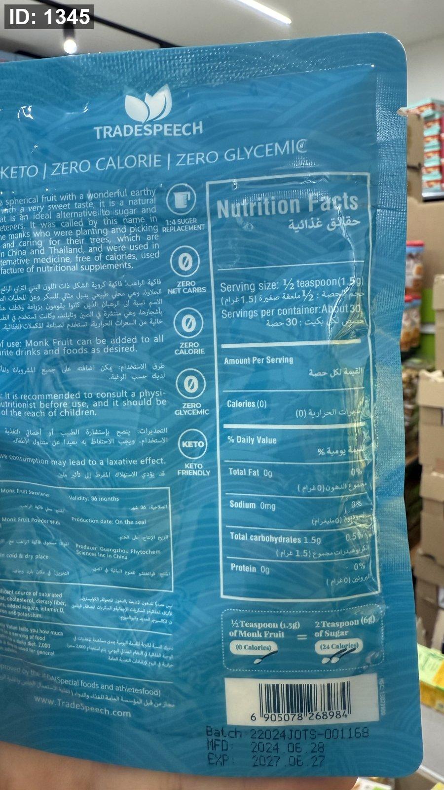 مُحلي "مونك فروت" (Monk Fruit) مع الإريثريتول، وهو بديل طبيعي صحي للسكر.