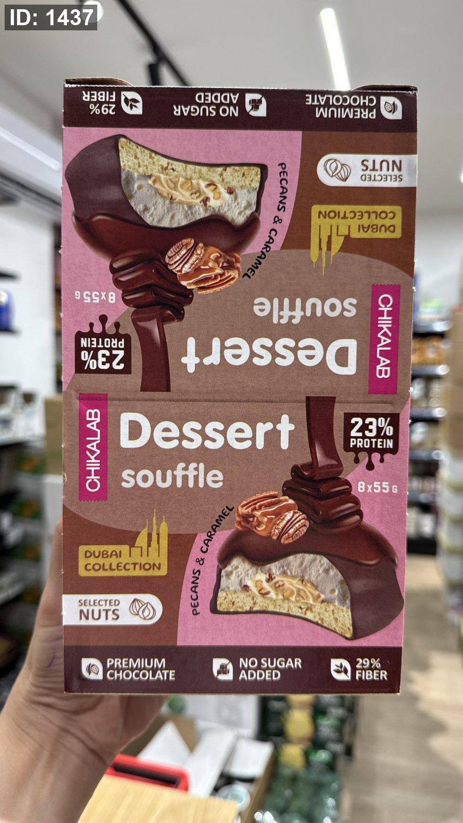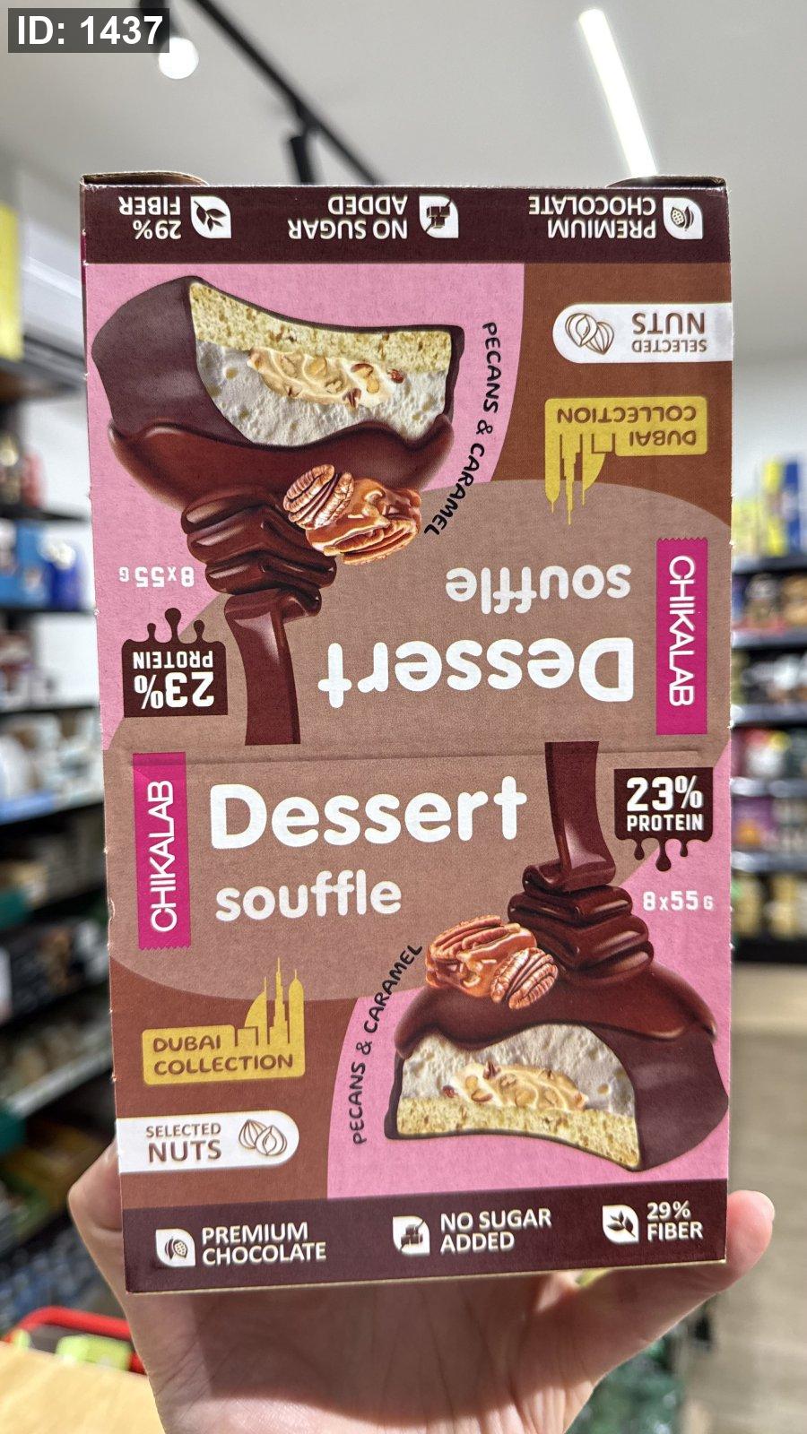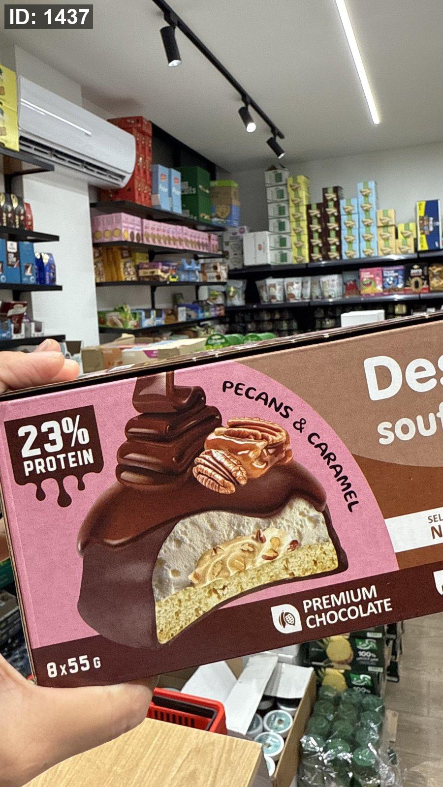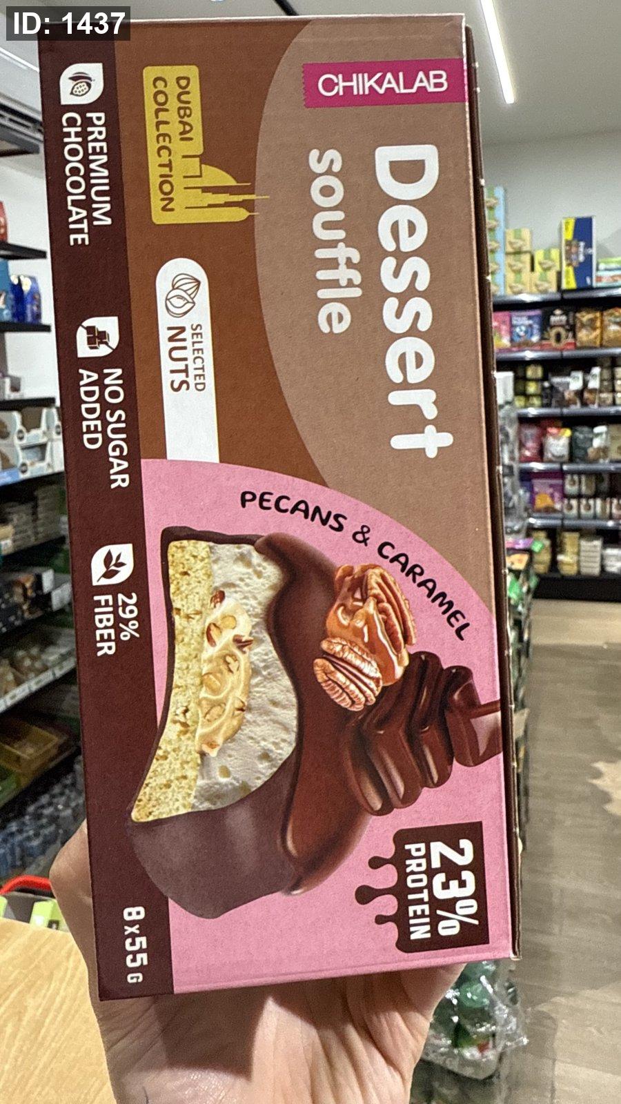 بوكس كوكيز مغطى بالشوكولاتة مع سوفلي وحشوة جوز البيكان والكراميل 23% بروتين 29% ألياف بدون سكر وزنه 55غم فيه 8 حبات