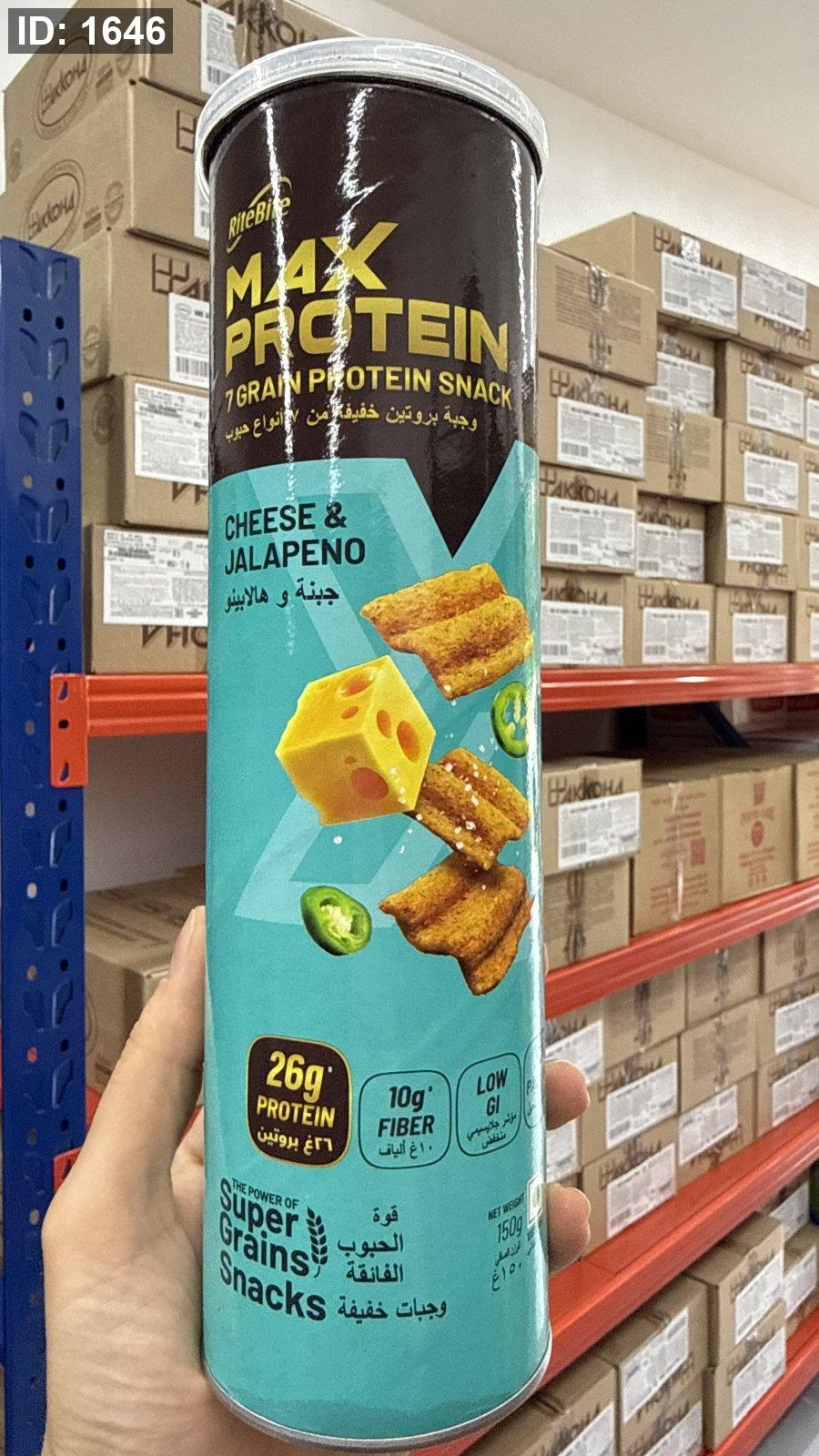 شيبس ماكس بنكهة جبنة الهلابينو عالي البروتين فيه 26% بروتين غني بالألياف بدون زيت النخيل وزنه 150 غم