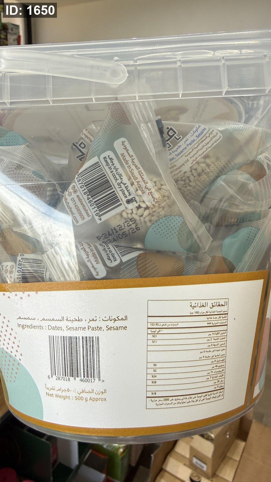 المكونات: مصنوعة من التمور الفاخرة والطحينة النقية والسمسم المحمص.