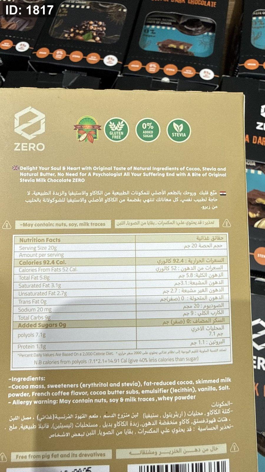 لوح شوكولاتة زيرو zero بالحليب والقهوة خالية من السكر والجلوتين وزنها 85 غرام