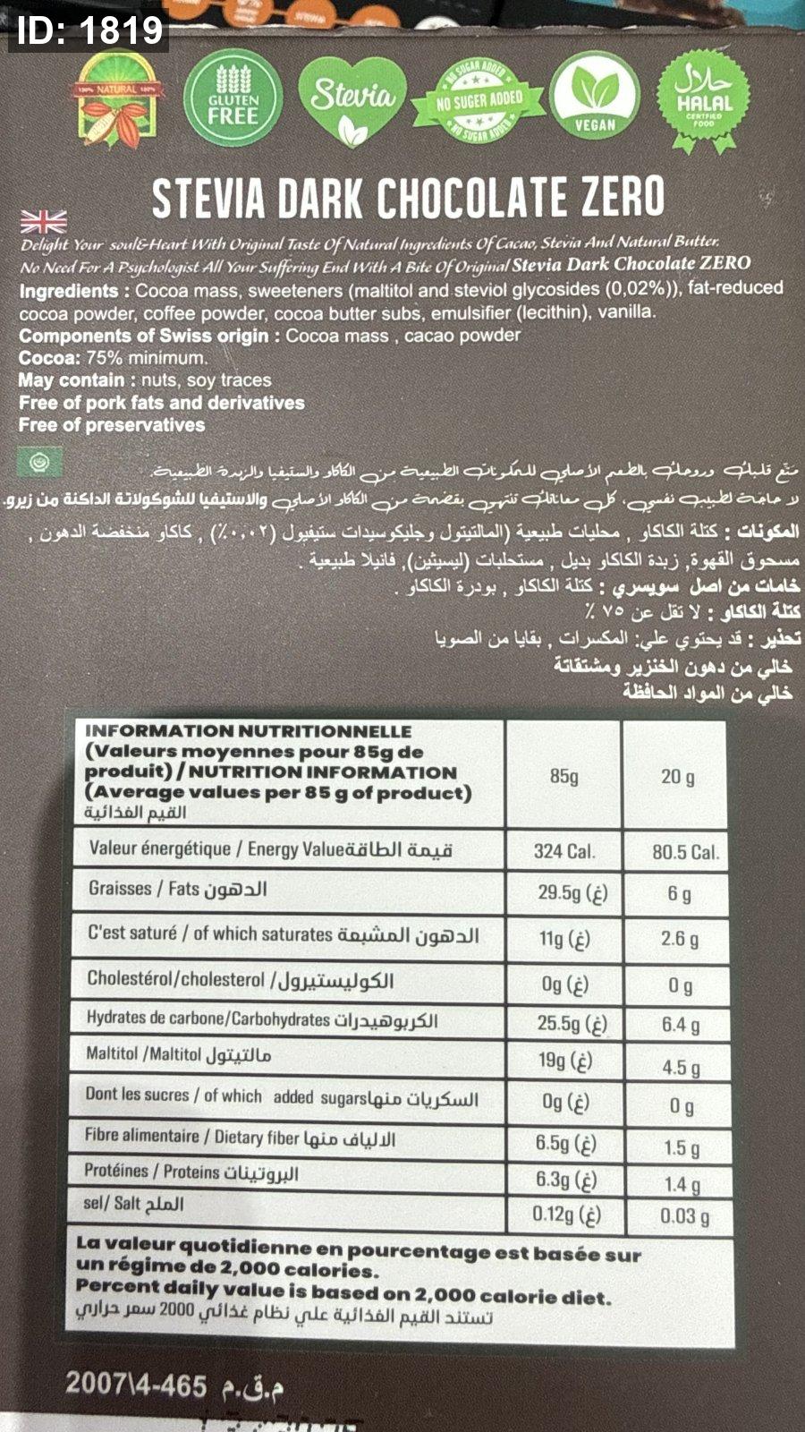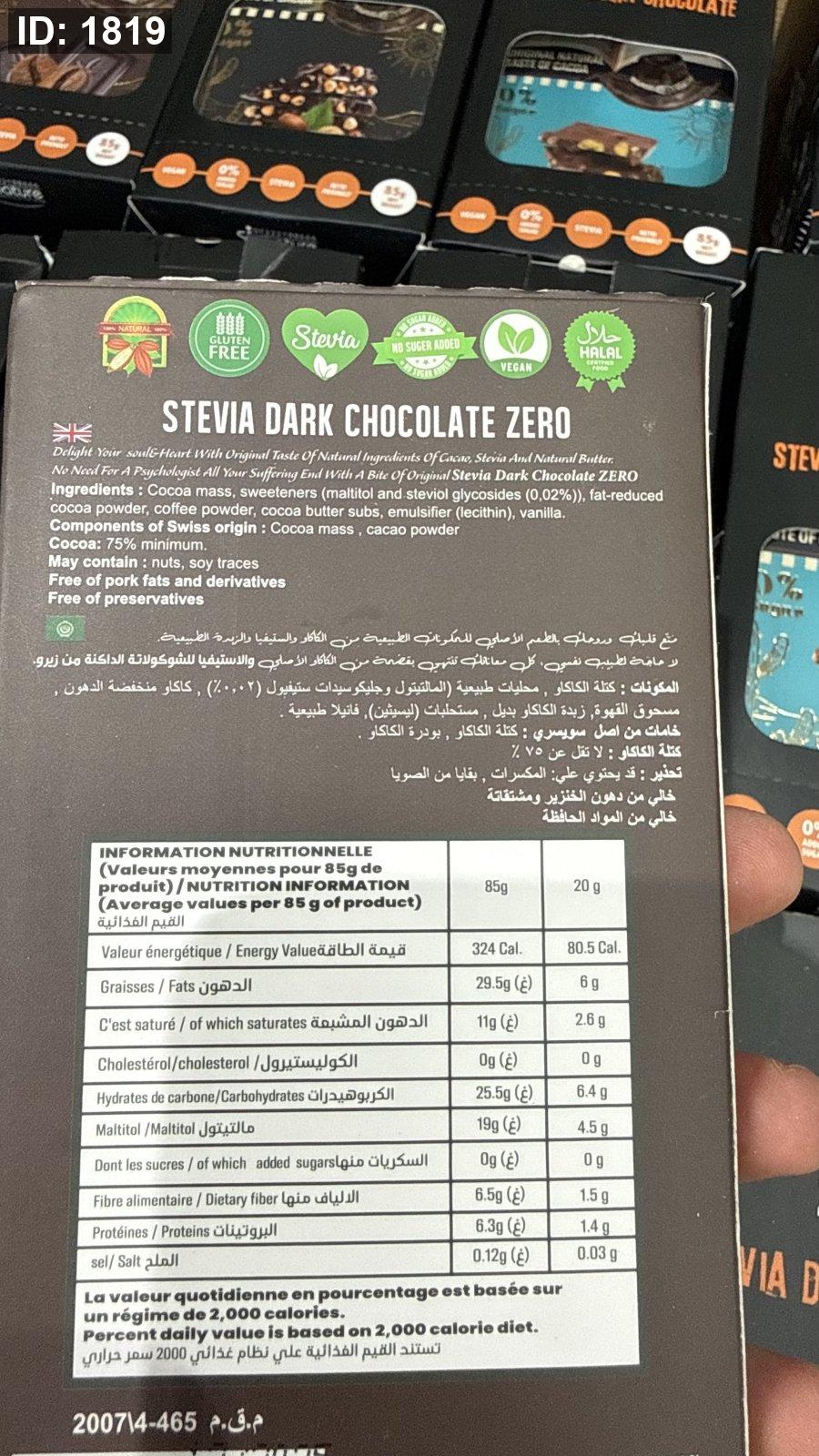 لوح شوكولاتة زيرو zero دارك والقهوة خالية من السكر والجلوتين وزنها 85 غرام