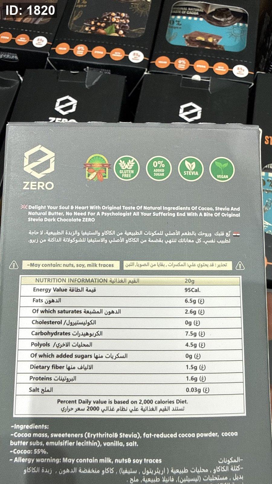 لوح شوكولاتة زيرو zero دارك 55% خالية من السكر والجلوتين وزنها 85 غرام