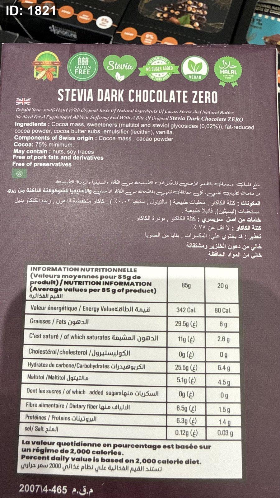 لوح شوكولاتة زيرو zero دارك 75% خالية من السكر والجلوتين وزنها 85 غرام