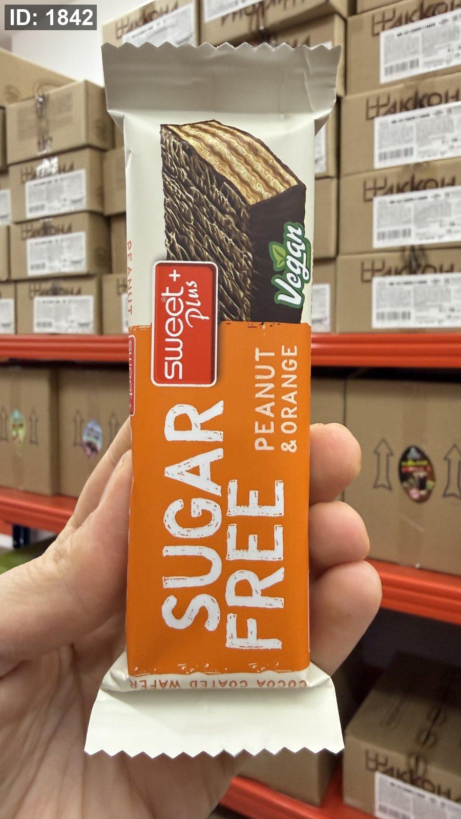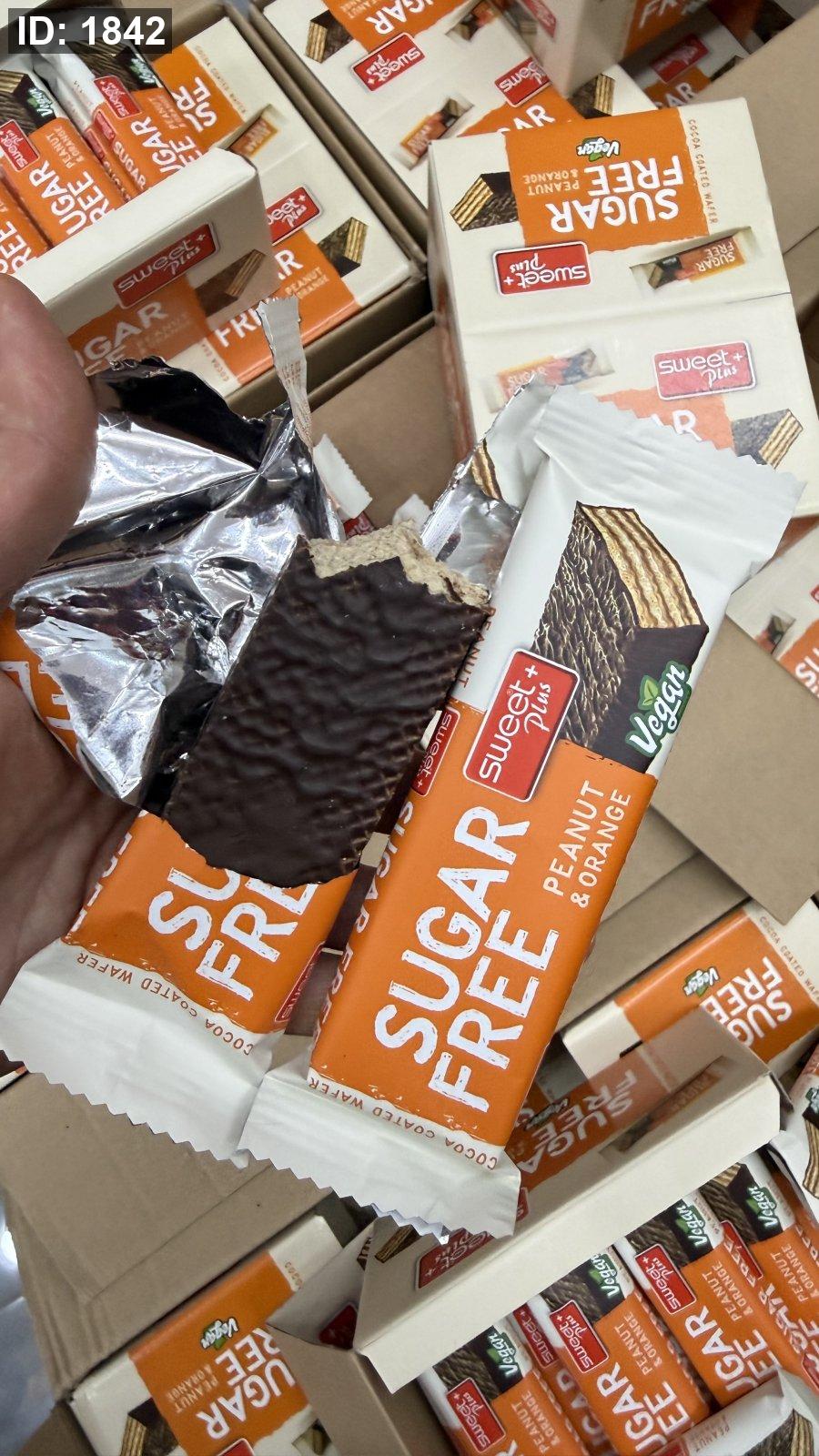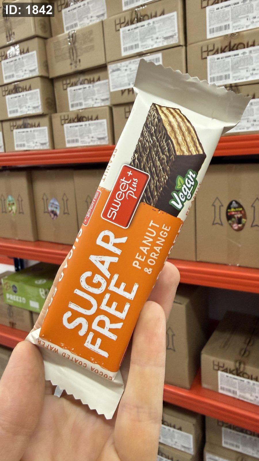 ويفر sweet plus بنكهة الفول السوداني والبرتقال ومغطى بالشوكولاته خالي من السكر وزنها 30 غرام