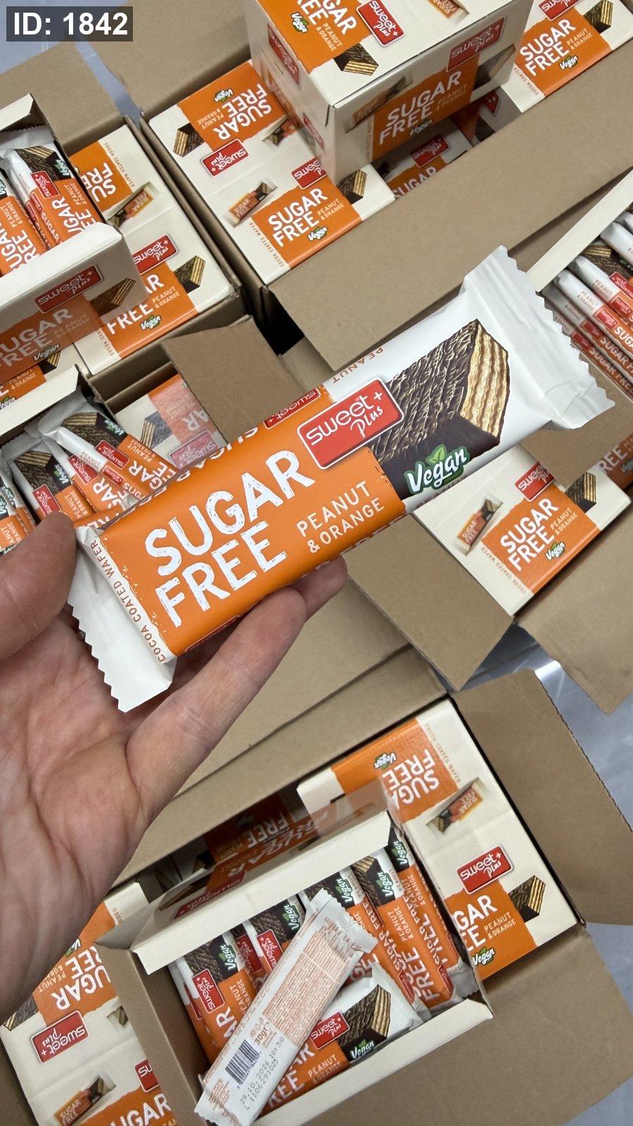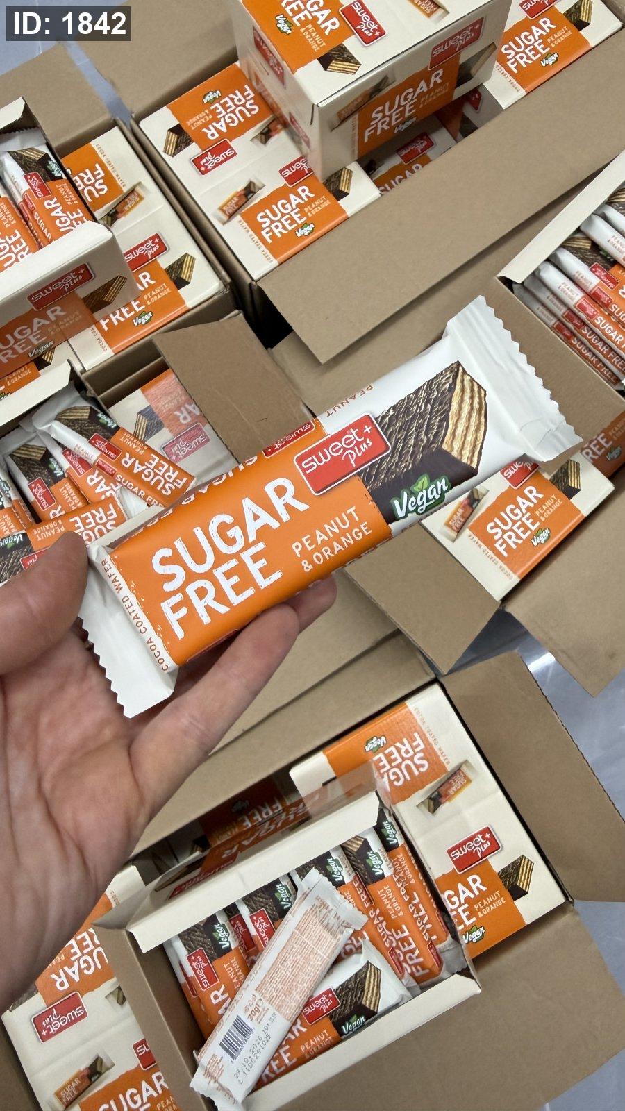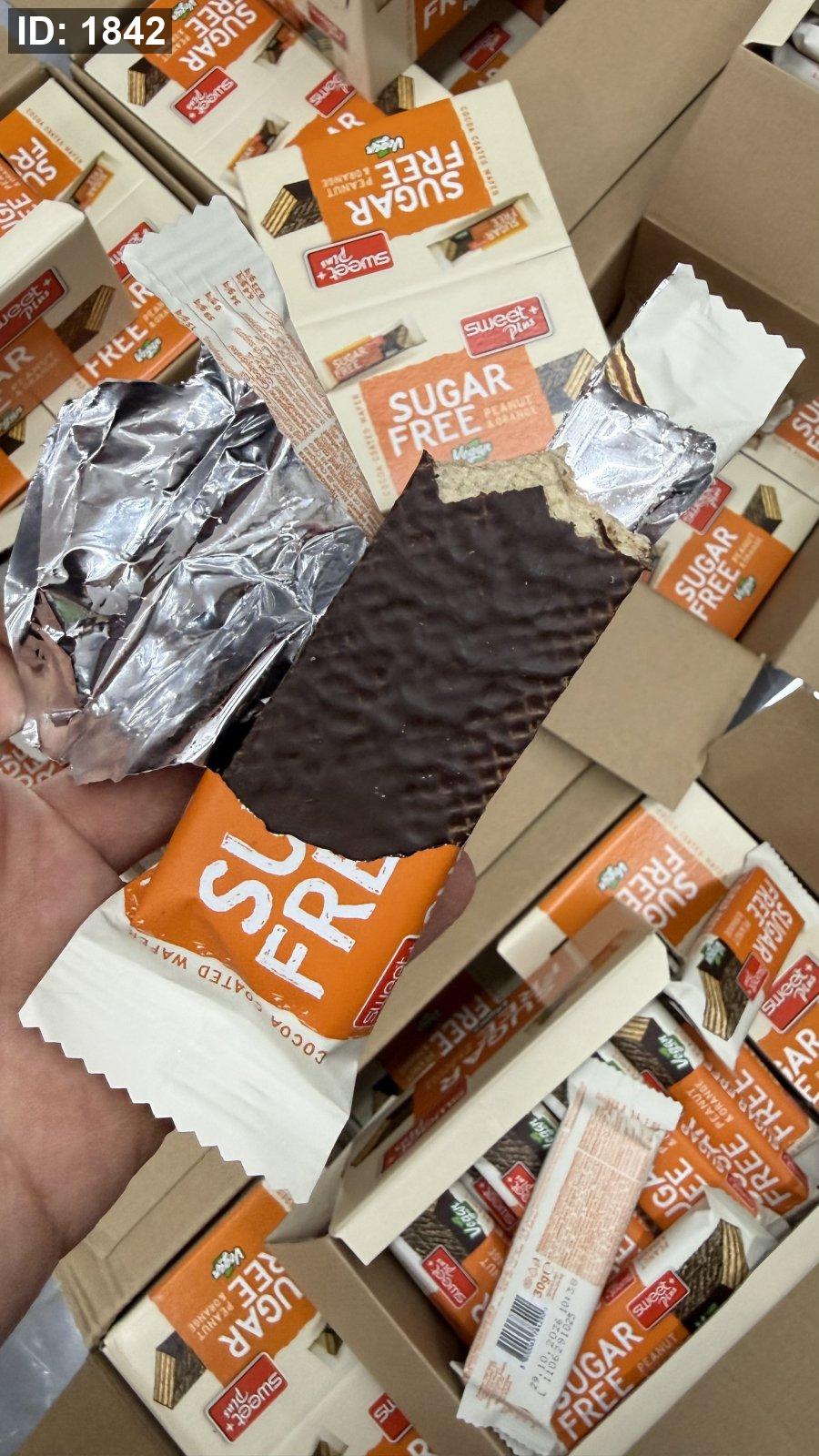 ويفر sweet plus بنكهة الفول السوداني والبرتقال ومغطى بالشوكولاته خالي من السكر وزنها 30 غرام