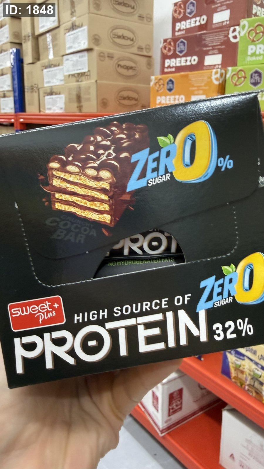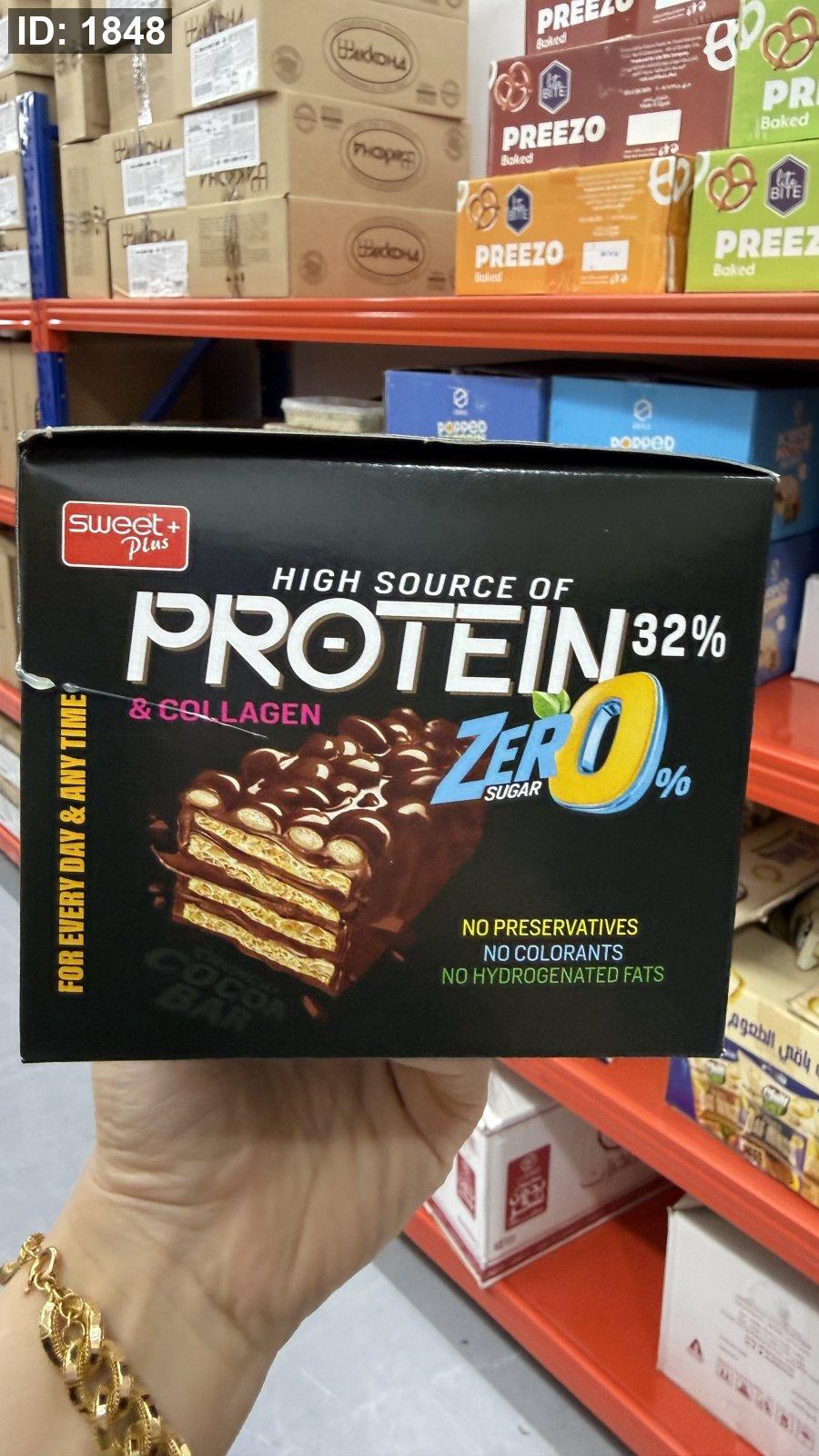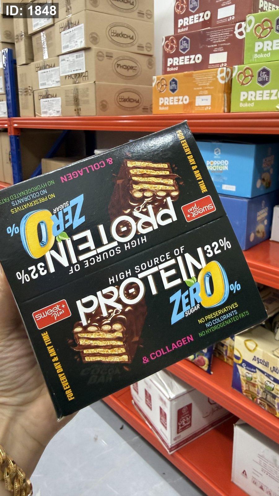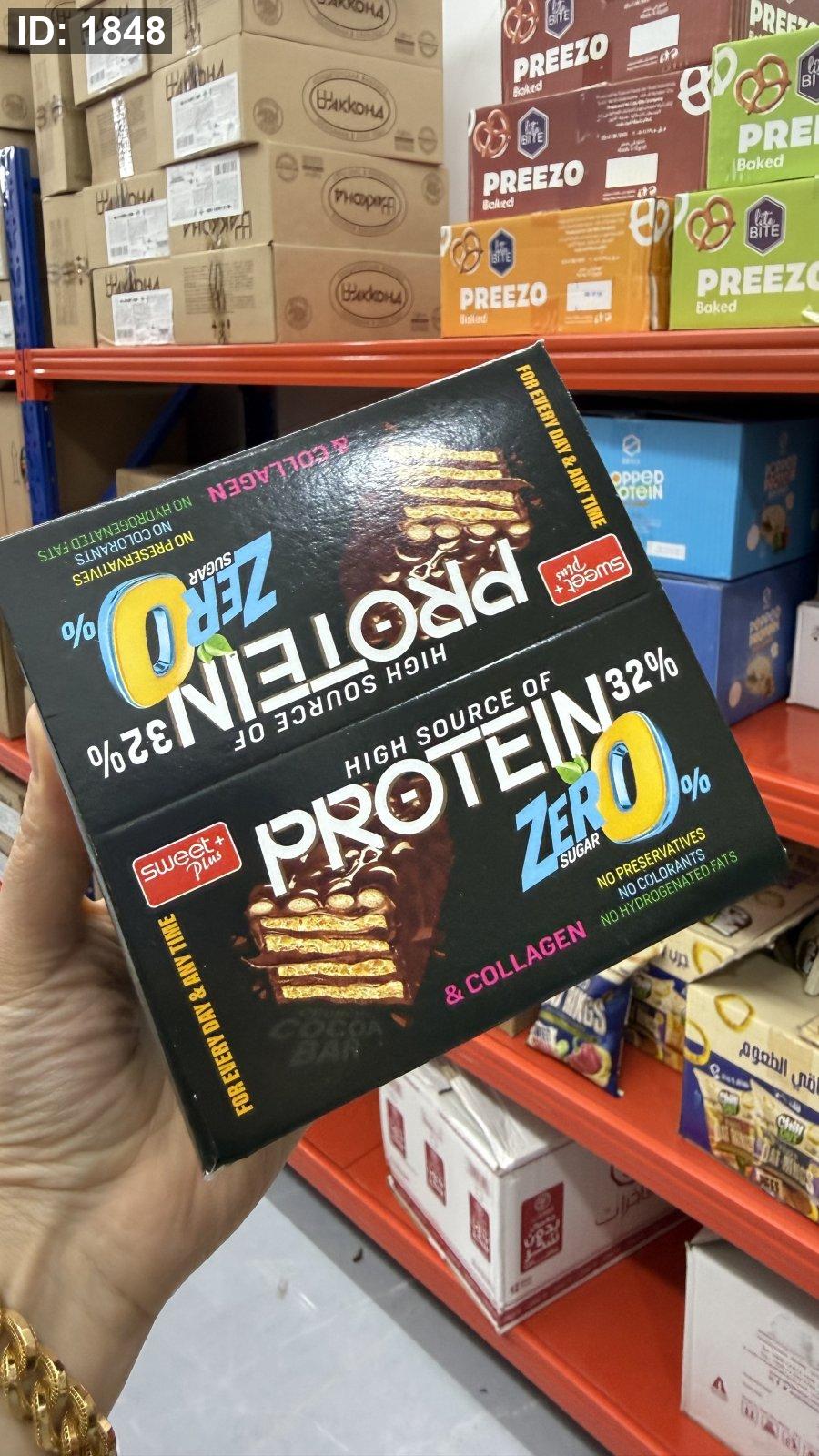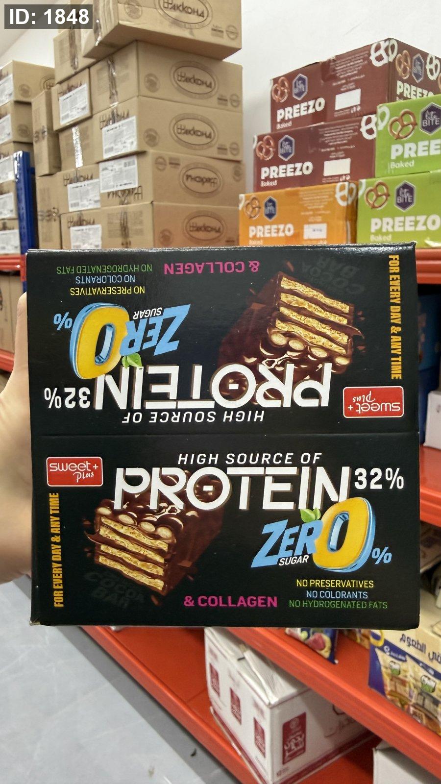بوكس = 12 حبة من ويفر بروتين sweet plus بالشوكولاتة كرسبي 32 ٪؜ بروتين مدعم بالكولاجين وخالي من السكر وزنه 42غرام