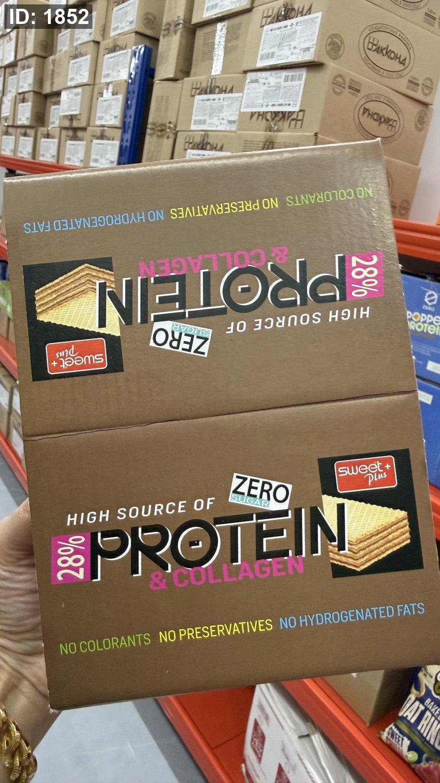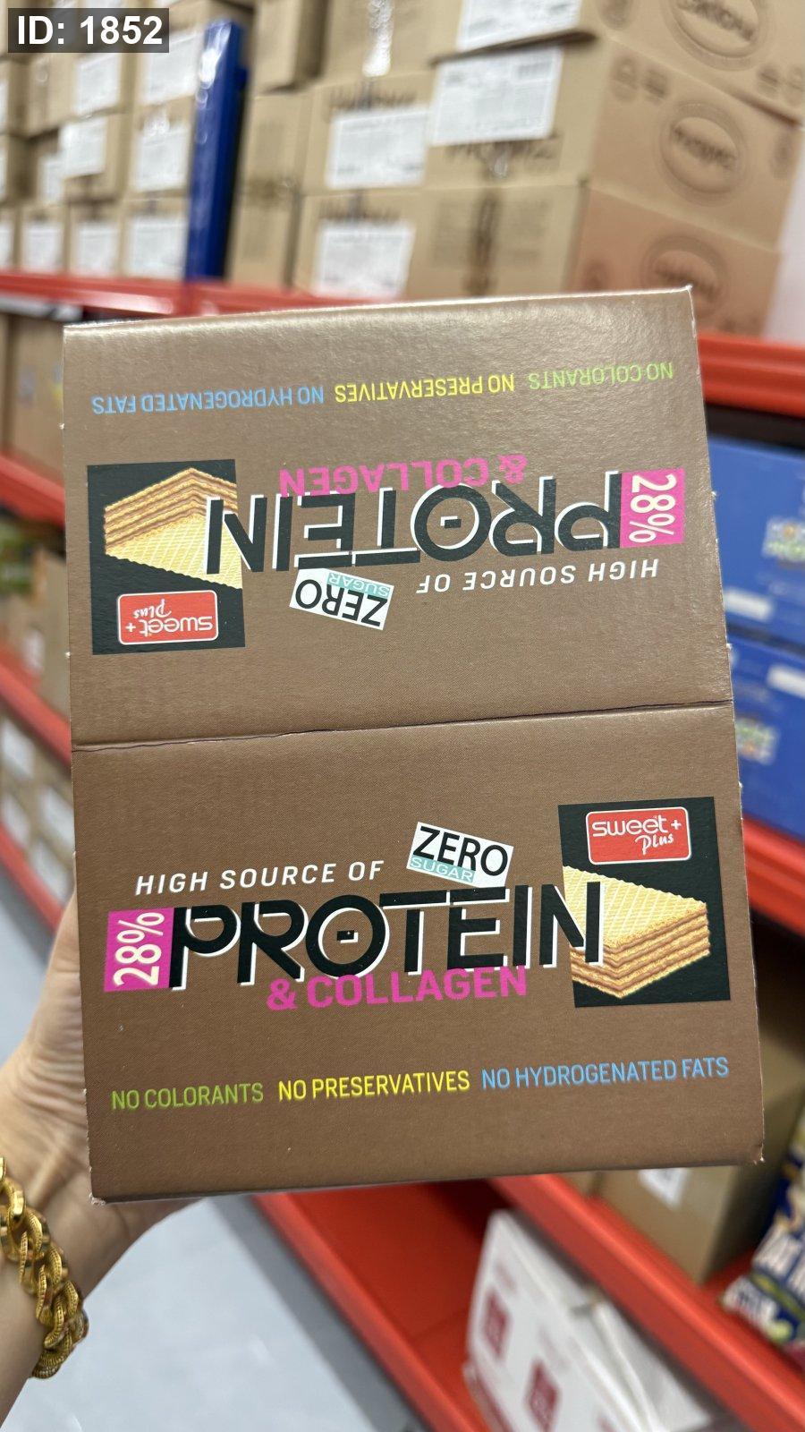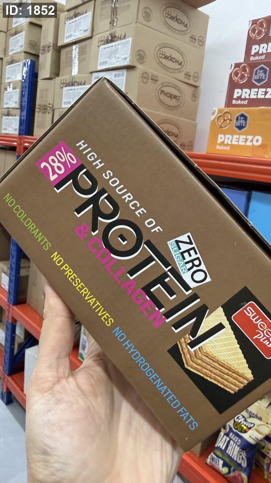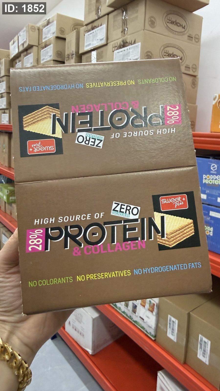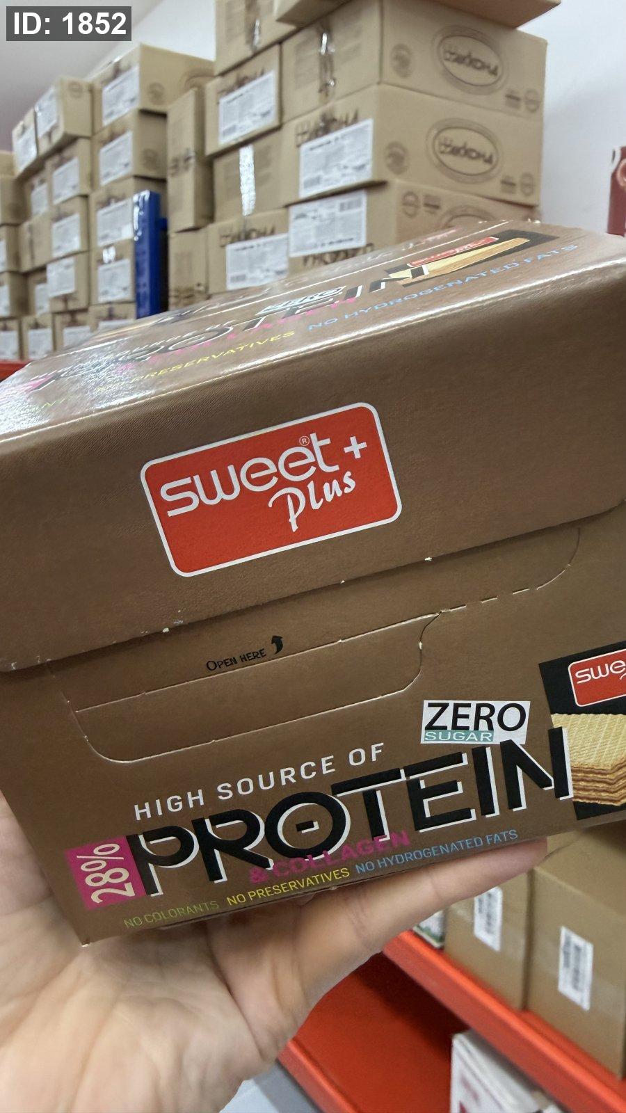 بوكس = 24 حبة من ويفر بروتين sweet plus محشي شوكولاته 28 ٪؜ بروتين مدعم بالكولاجين وخالي من السكر وزنه 28 غرام